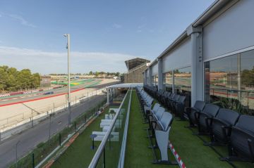 - Accès à 2 terrasses : Terrasse au même étage avec vue panoramique sur le dernier virage + entrée dans le pitlane et terrasse au niveau inférieur avec vue plus proche de la piste et des monoplaces de MotoGP.